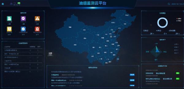 该页面通过分仓形式将云平台系统的所有基本信息全部展示在大屏上,主要包含了项目总览,企业隐患排名,报警信息列表,监测点位以及报警统计,监测点位地理位置,工单任务统计等