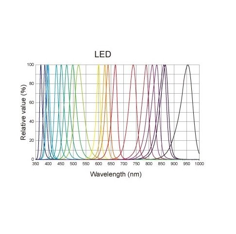 365 nm、380nm、390 nm、400 nm、410 nm、420 nm、440 nm、445 nm、450 nm、460nm、465 nm、470nm、475nm、490 nm、500 nm、520 nm、525 nm、530 nm、555nm、560 nm、590 nm、600 nm、610 nm、620 nm、630 nm、660 nm、740 nm、850 nm、940 nm、5500K白光。 |