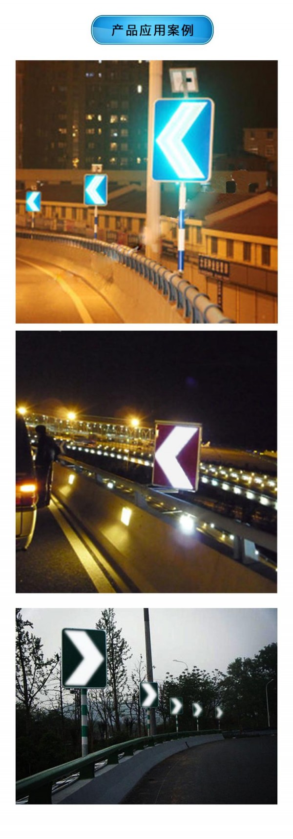 太阳能诱导标志牌是以单晶硅太阳能电池组件为能源,它利用太阳能电池板将白天的阳光转换成电能贮存于蓄电池中,当夜幕降临、视线昏暗或雨雾天气等视线不佳情况下,线性诱导标志牌上的发光二极管自动启动闪烁,通过LED发出亮光来勾画图案轮廓,传达交通信息。主动发光线性标志发出的光线特别明亮、醒目,具有强烈的警示作用。