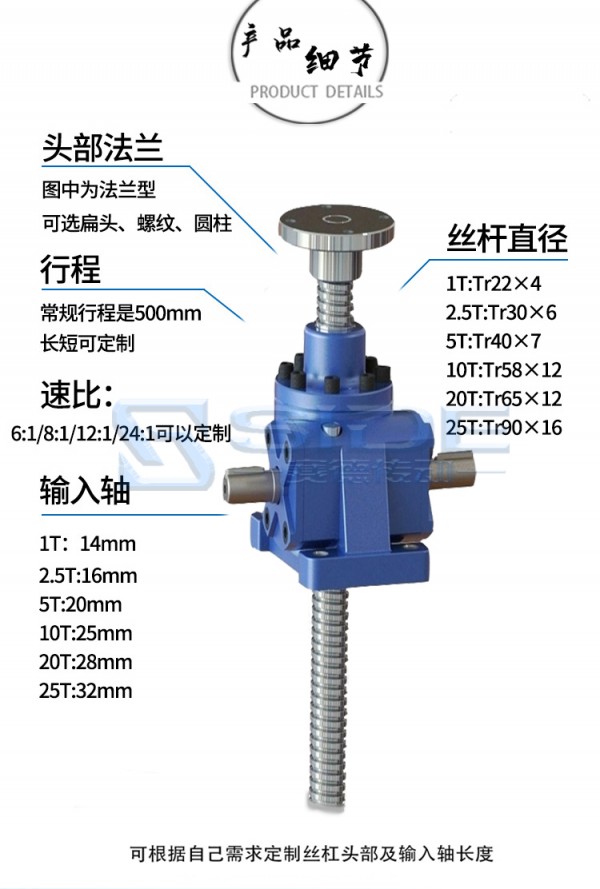 (丝杆轴旋转,活动螺母移动)。丝杆轴顶端为圆柱形,所以在长行程时,