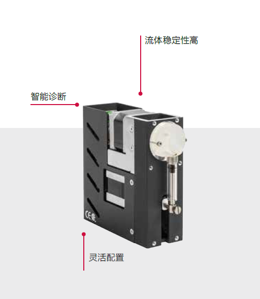 Norgren一开始便参与项目开发,帮助客户设计流路;如何将样品巧妙地引入持续流动的鞘液中是这一设计的关键点。通过与客户的紧密合作,深入了解其应用需求,我们设计了一套基于现有注射泵进行的产品改造方案。通过将新型的电子控制系统加入原V6注射泵,解决了该仪器需要的流速变化范围大的要求。改装后的泵可在高流速与低于1μl/s的慢速分配之间快速切换,循环寿命可达百万次。