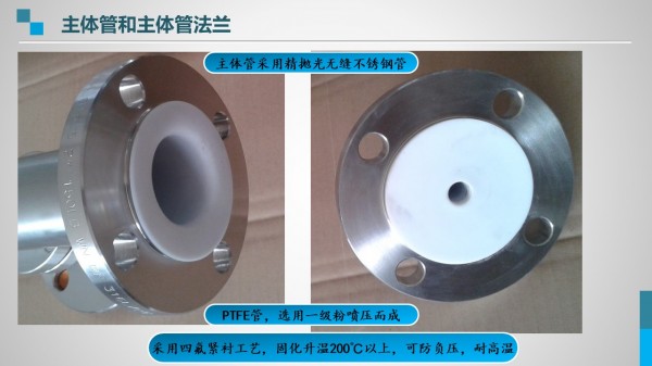1、外管用精抛不锈钢管,内衬聚四氟乙烯(PTFE)管。