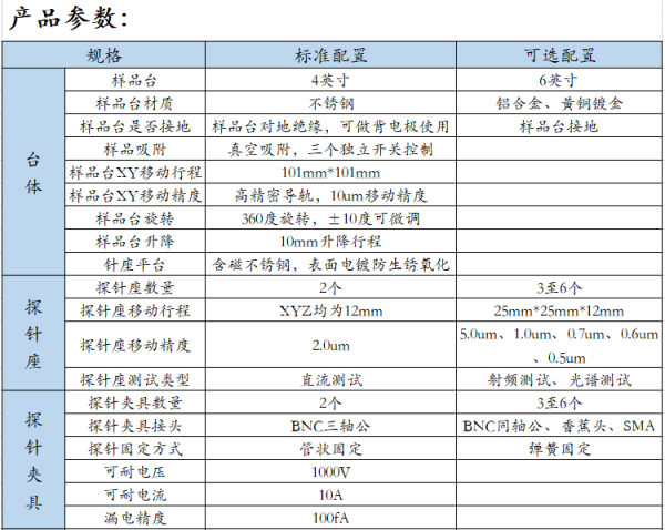 目前公司主要产品有探针台系列:4英寸、6英寸、8英寸、12英寸常规探针台,高温探针台、高低温探针台、真空探针台、气敏探针台、双面探针台、射频探针台、激光探针台等,公司拥有探针台行业经验丰富的设计团队,探针台类型齐全,也可满足客户的定制化需求;公司同时经营光学平台、位移台、源表、测试仪器等行业相关设备;