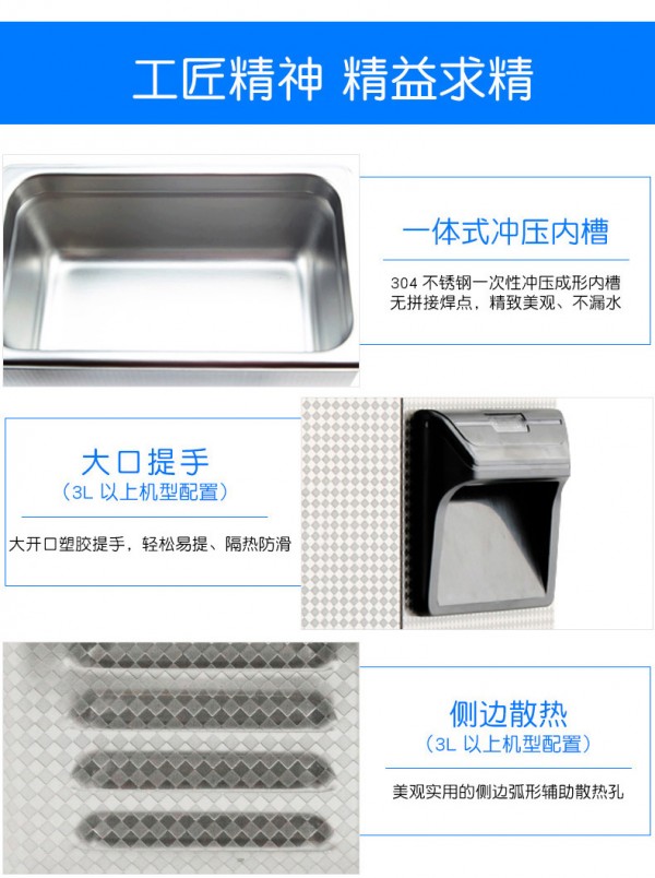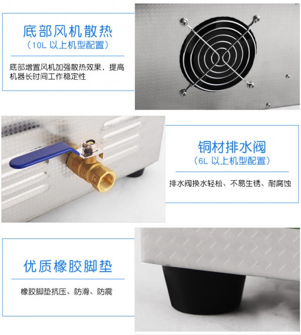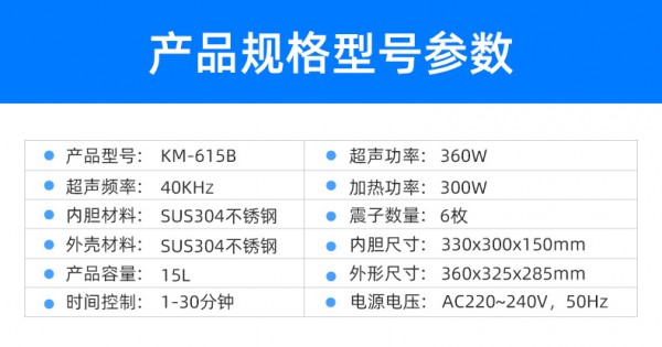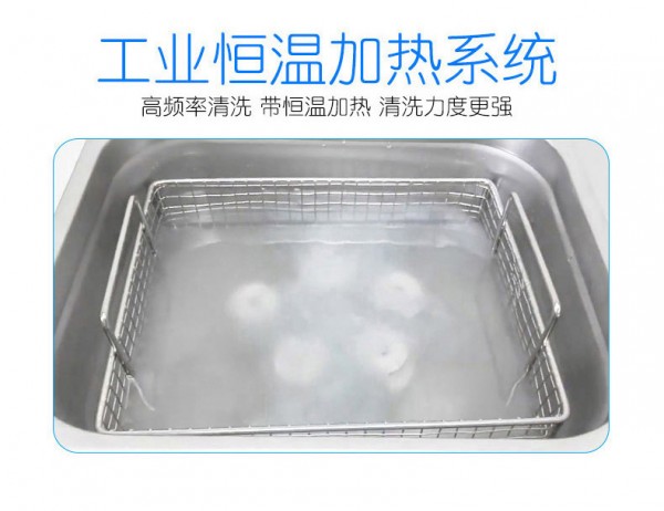 科盟超声波清洗机工业实验室学校五金设备产品特点: 使用自来水、纯净水;水性清洗剂或者无腐溶剂清洗; 大功率换能器清,可用肉眼观察到; 大屏数显,触摸控制,精准可调定时; 全不锈钢外壳与隔音盖子、内胆,精致做工更显高档; 冲压一体成型内槽,提升防漏水性能,更经久耐用。