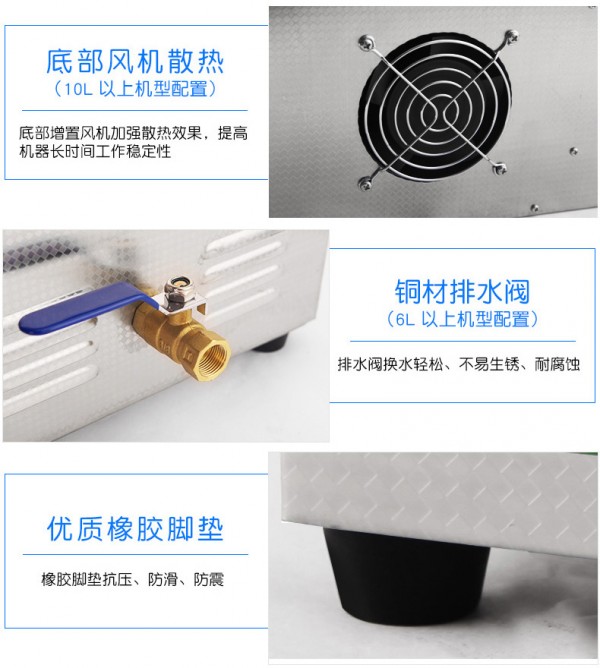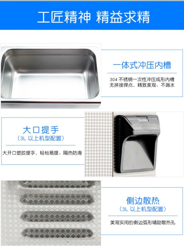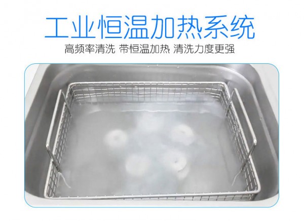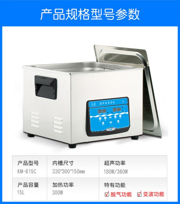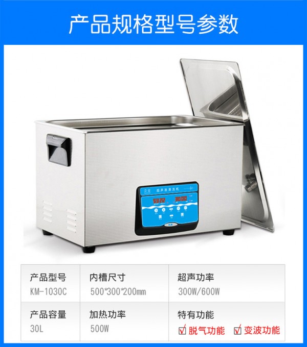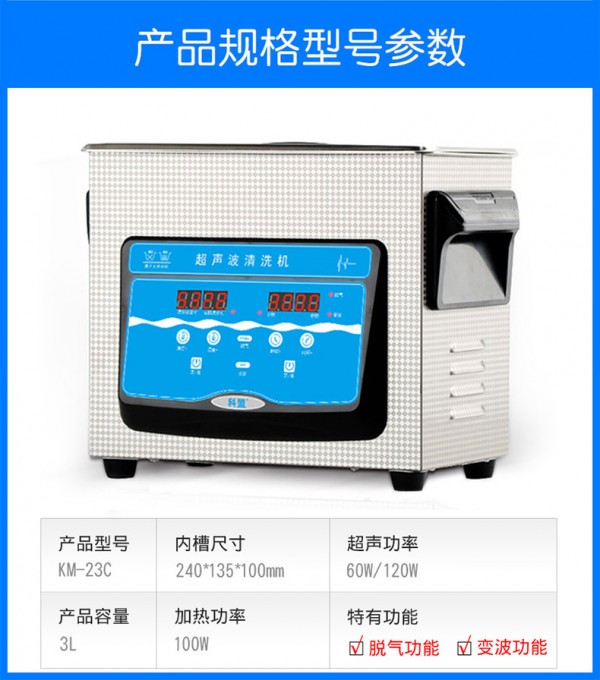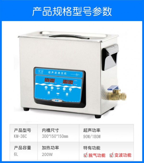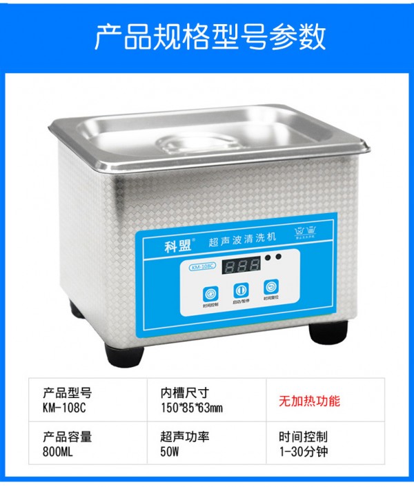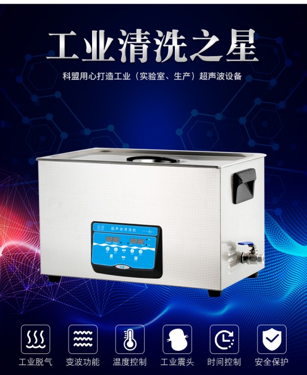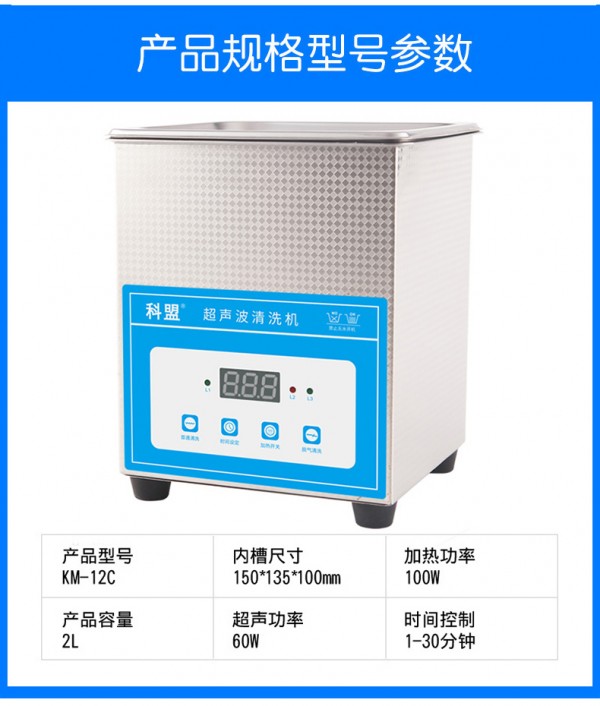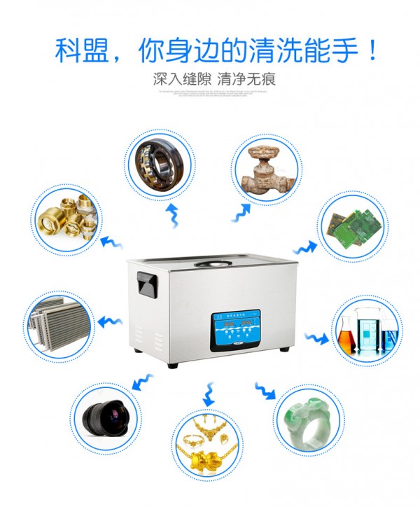 科盟工业超声波清洗机实验室五金小型清洗器 产品特点: 使用自来水、纯净水;水性清洗剂或者无腐溶剂清洗; 大功率换能器清,可用肉眼观察到; 大屏数显,触摸控制,精准可调定时; 全不锈钢外壳与隔音盖子、内胆,精致做工更显高档; 冲压一体成型内槽,提升防漏水性能,更经久耐用。