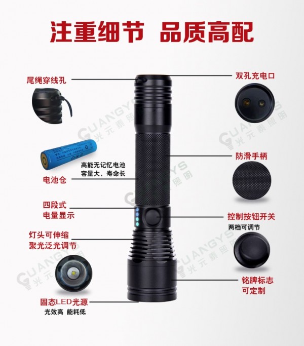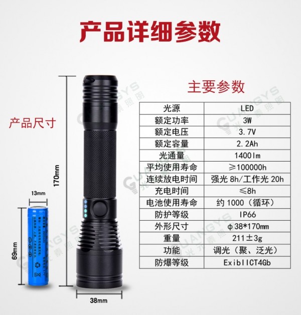 经济环保:华荣同款BAD202伸缩变焦的免维护防爆手电筒高能无记忆电池,容量大、寿命长,可随时充电,循环使用,自放电率低,经济环保;