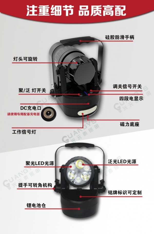 适用性强:聚/泛光模式可调,通过转动灯头和提手,可调节灯光照射角度,并设有黄光警示灯功能,提醒来往车辆注意安全,能过满足不同场所照明需求;
