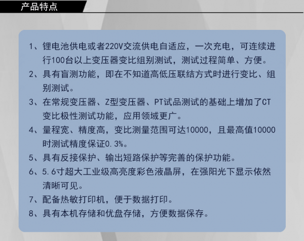 公司集研发、生产、销售、服务于一体,经营范围主要是电力系统检测、测量、计量仪器、仪表;电力设备监测装置、高低压电器设备及装置、电力电子设备和系统软件的开发、生产、销售。目前主要产品包括:变压器直流电阻测试仪、变压器变比组别测试仪、变压器容量测试仪、变压器损耗参数测试仪、电容电感测试仪、接地引下线导通测试仪、回路电阻测试仪、氧化锌避雷器带电测试仪、配网电容电流测试仪等。产品广泛应用于风电、水电、核电、火电等发电企业、各地各级供电系统及水利、铁路、石油、矿山、冶金、化工、机械、电子等众多领域。产品以优越的性能、简便的操作、高度的智能化博得用户的一致好评,树立了良好的信誉。