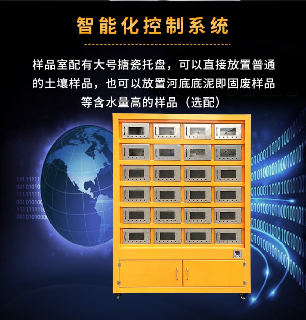 新型的土壤干燥箱采用模拟室内空气流动模式,即风干模式进行土壤的干燥。干燥空气是经过粗过滤和活性炭吸附的洁净热空气。因整机结构的设计、巧妙和完善,从而是每个样品室流动的洁净热空气超越室内空气。本产品有6室/12室/24室。