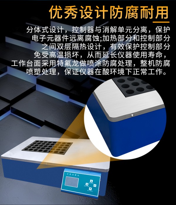 分体式设计,控制器与消解单元分离,保护电子元器件远离腐蚀;加热部分和控制部分之间双层隔热设计,有效保护控制部分免受高温损坏,从而延长仪器使用寿命,工作台面采用特氟龙做喷涂防腐处理,整机防腐喷塑处理,保证仪器在酸环境下正常工作。