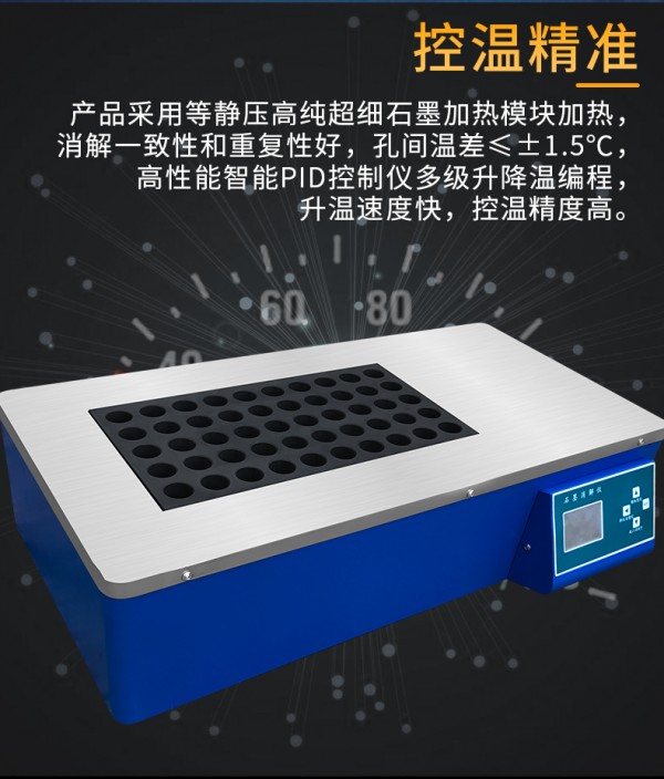 2、控温精准消解均匀 产品采用等静压高纯超细石墨加热模块加热,消解一致性和重复性好,孔间温差≤±1.5℃,高性能智能PID控制仪多级升降温编程,升温速度快,控温精度高。