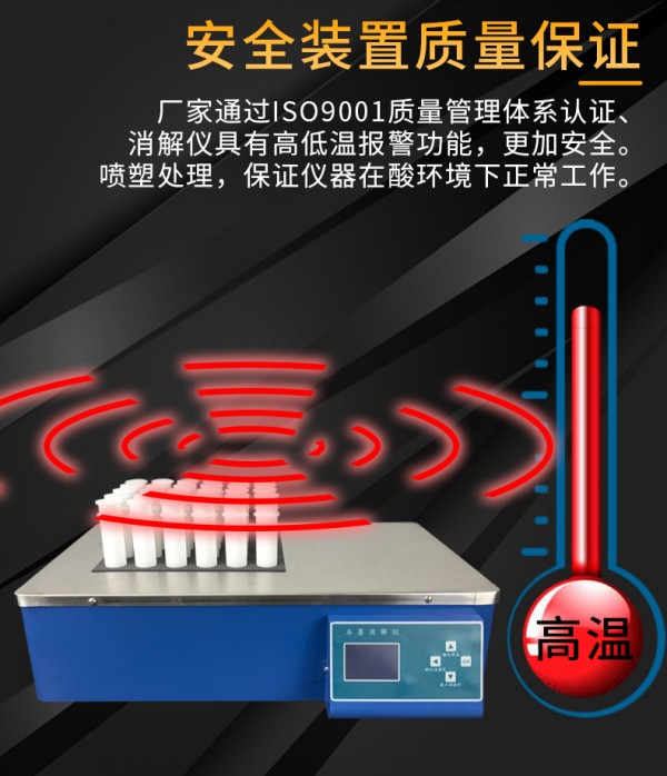 6、安全装置质量保证 厂家通过ISO9001质量管理体系认证、消解仪具有高低温报警功能,更加安全。