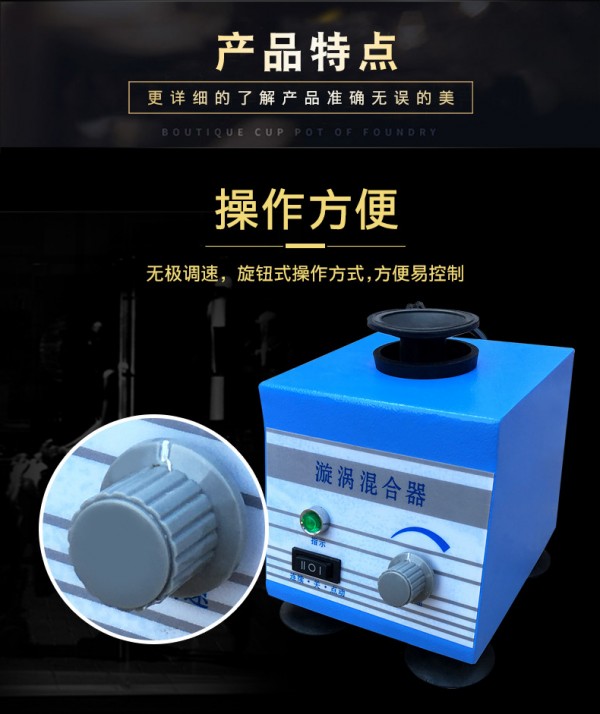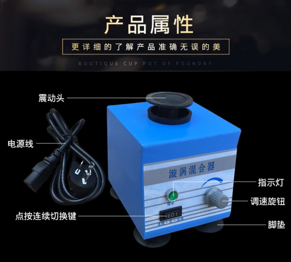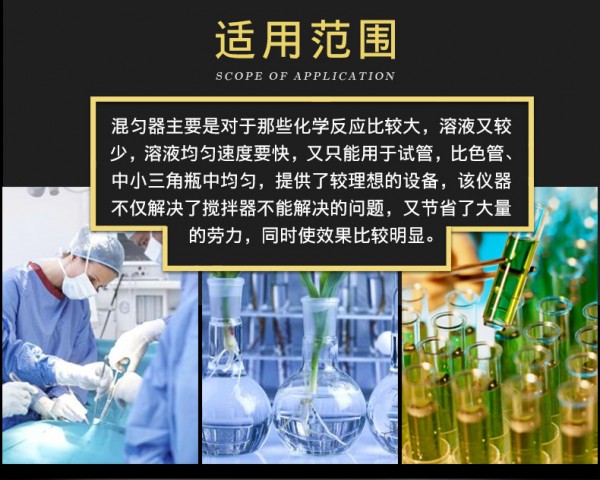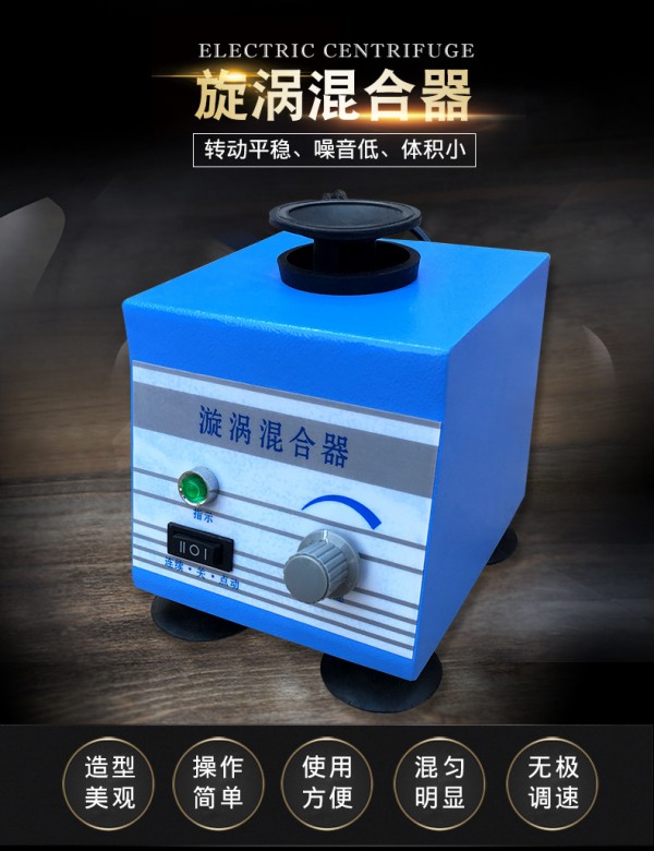 旋涡混合器主要是对于那些化学反应比较大,溶液又较少,溶液混匀速度要快,又只能用试管、比色管、中小三角烧瓶中混匀,提供了较理想的设备。该仪器不仅解决了搅拌器不能解决的问题,又节省了大量劳动力,同时使操作比较容易掌握。而且既快又准确。该机原理是电机带动一定角度的偏心。