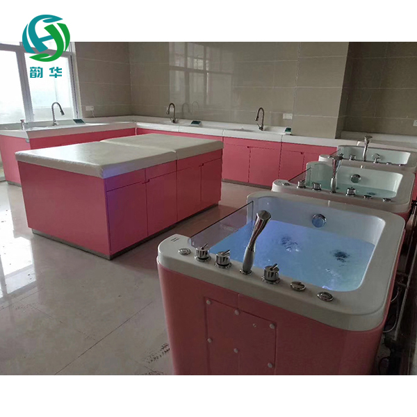 泰州韵华婴儿游泳池 采用PM高分子材质用模具一体成形,表面光滑,耐酸碱与耐腐蚀性程度高,池上面可套防感染一次性塑料套,池边有防溢水导水沟及下水,台面后端设有恒温控制操作系统,操作屏上有电动下水按键。