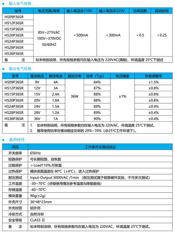 小型ACDC电源模块HS24P36SR,具有交直流两用、输入电压范围宽、高可靠性、低功耗、安全隔离等优点。电源的效率高达90%和低于0.1W的低空载功耗。可以提供基本的防尘和防水功能。
