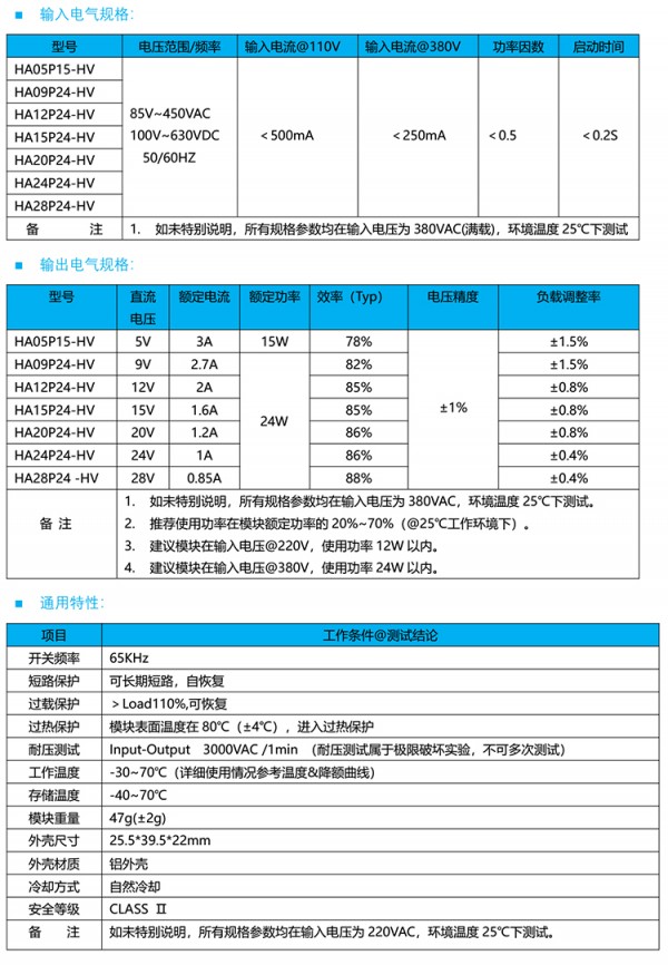 宽电压输入ACDC电源模块HA12P24-HV产品性能: