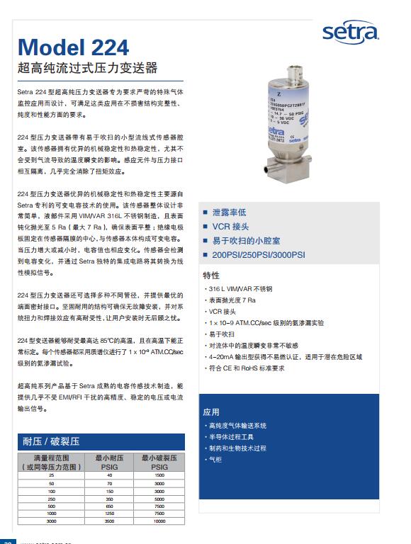 美国Setra西特224压力变送器压力传感器专为要求严苛的特殊气体监控应用而设计,可满足这类应用在不损害结构完整性、纯度和性能方面的要求。