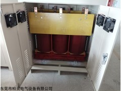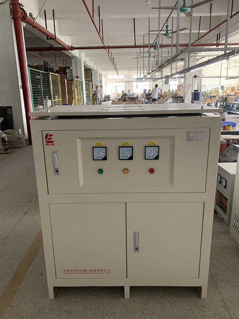 该三相变压器是根据客户实际情况定制的,特别适合进口精密仪器设备专用,变压器内部铁芯采用美国杜邦绝缘纸绕制,输入变压器空气开关前安装三相电源指示灯,通过电压表监控三相相电压、电流表显示变压器输入三相电流。输出接线端设置在外箱的顶部。