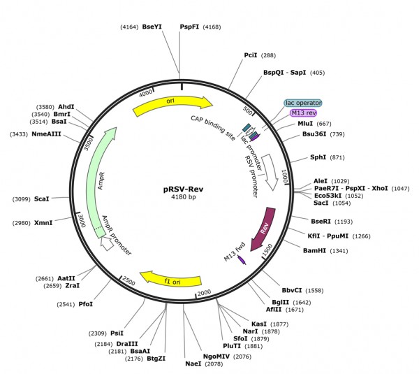 是第三代慢病毒包装辅助质粒,载有病毒rev基因。pRSV-Rev与pMDLg/pRRE(JY03035)和pMD2.G(JY03027)构成第三代慢病毒包装系统,用于包装第三代慢病毒载体质粒,这4个质粒组成四质粒系统(即第三代慢病毒系统)。将这4个质粒共同转染293T等细胞以包装重组慢病毒,用此慢病毒感染目的细胞,即可实现基因敲除、敲降和过表达等。慢病毒包装原理、包装质粒的选择、包装系统和包装步骤请参考:江苑生物网站→新闻中心