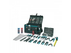 工具箱,可锁,带有可调式背带,配备:电缆切刀、对角切割器、微型切刀、剥线和护套剥除工具、压接工具套件、组合钳、尖嘴钳和水泵钳、VDE螺丝刀和十字螺丝刀、控制柜钥匙、电压测试仪、套管盒、刀片、卷尺、连续性测试仪、标识工具、套头和开口扳手套件、可调式扳手、T型内六角扳手、护目镜、锤子、47件式套筒扳手套件,1/4"
