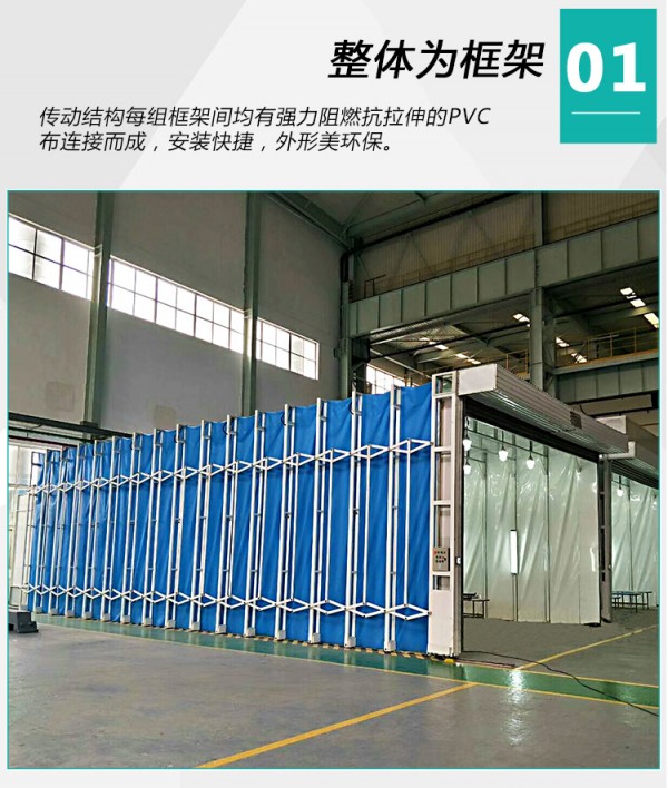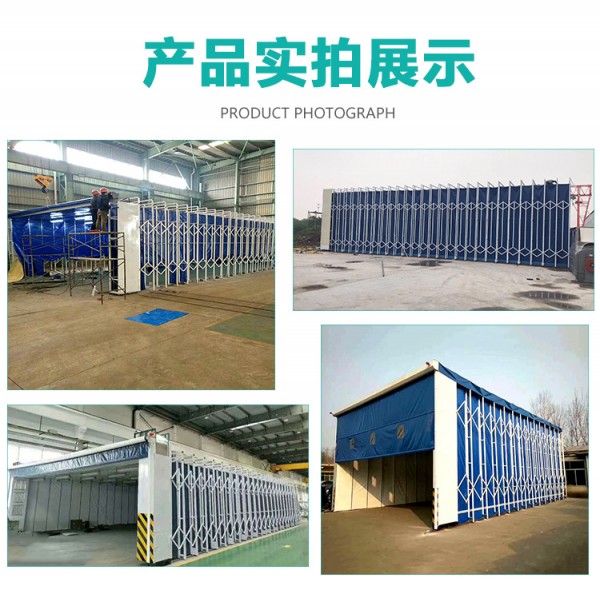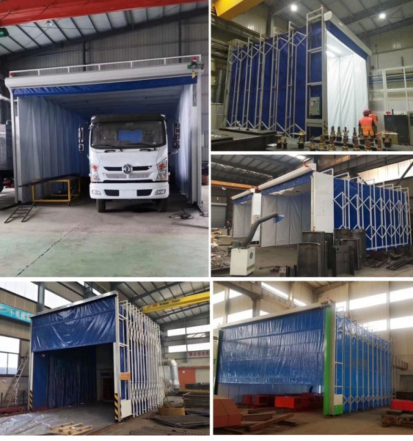 移动伸缩喷漆房整体为框架传动结构,每组框架间均有高强度、阻燃、高拉伸的PVC布密封连接而成,安装快捷,外形美观。