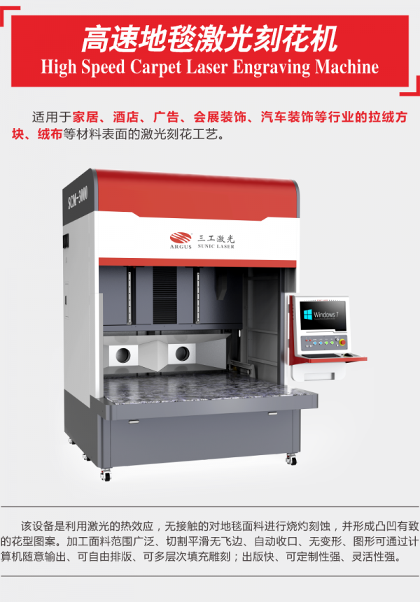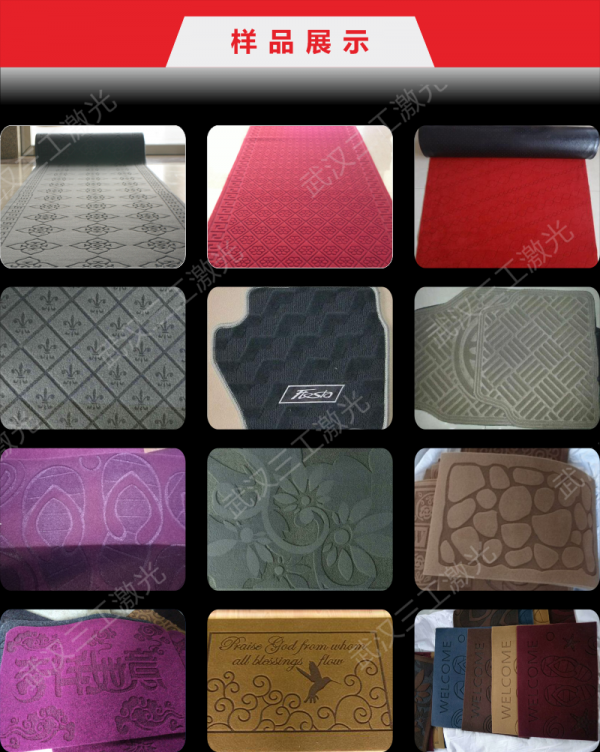 该设备是利用激光的热效应,无接触的对地毯面料进行烧灼刻蚀,并形成凸凹有致的花型图案。加工面料范围广泛、切割平滑无飞边、自动收口、无变形、图形可通过计算机随意输出、可自由排版、可多层次填充雕刻;出版快、可定制性强、灵活性强。