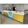 池内为适用婴儿洗澡设计了曲线模形,池上面可套防感染一次性塑料套,池边有防溢水导水沟及下水,有护理操作人员抗疲劳靠手设计,台面后端设有温控操作系统,池边设有洗澡用品放置专用区。