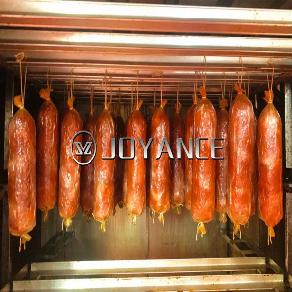 上色: 全自动老火腿烟熏炉,红肠蒸煮烟熏设备烟熏的过程同时上色,想熏制成淡黄色用木屑加白糖,熏制成棕色用木屑加红糖,颜色的深浅可以根据糖含量多少来确定。