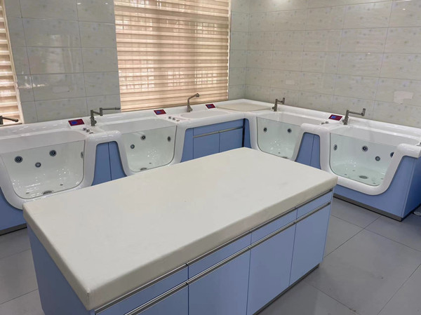 产品介绍:婴儿洗浴设备常见于妇幼保健院,医院产科,月子中心,母婴会所等,为刚出生的宝宝提供优良的洗浴环境。此产品为定制产品,需根据房间尺寸定制方案。、婴儿洗浴中心由婴儿洗礼池,婴儿游泳池,护理平台,扶触软包台,洗手池等组成。洗礼池和游泳池,洗手池,护理平台,转角平台都采用面层为优质的A级PMMA高分子复合材料一体成型,表面细菌残留量远远低于不锈钢,人造石,陶瓷盆和其他普通塑料。婴儿洗澡池底部圆滑突起设计;给婴儿一防滑支撑点,防止婴儿在池内滑动,造成意外呛水。