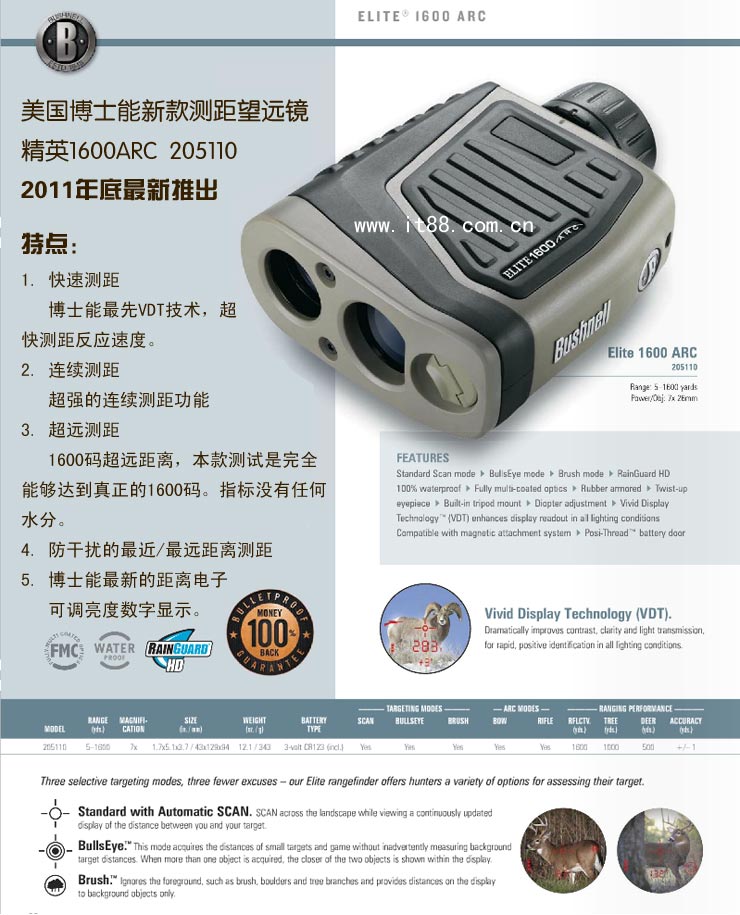 美国博士能BUSHNELL ELITE 精英1600ARC 望远镜式测距仪 1600码 测距测角测水平距离防水 2011年新款 VDT