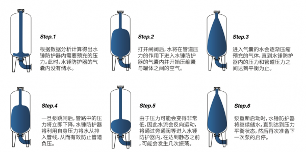 青海宁夏引水灌溉泵房用水锤消除罐用在供水泵房中,安装在水泵的出口侧。它利用气体体积与压力特定定律工作,管路压力大于罐内压力,水进入罐体。当管路压力小于罐内压力,水从罐内排出。起到平衡管道压力的作用,消除停泵引起的正水锤、负水锤和弥合水锤。