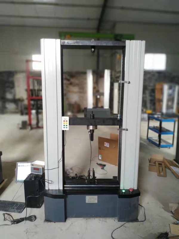 该机采用电脑控制由控制系统发出相关指令驱动电机转动,电机通过连轴器带动减速机构转动,减速机构通过安装在其输出轴上的滚珠丝杆转动使试台(中横梁)移动,从而对试样施加拉力或压力实现了试验目的。