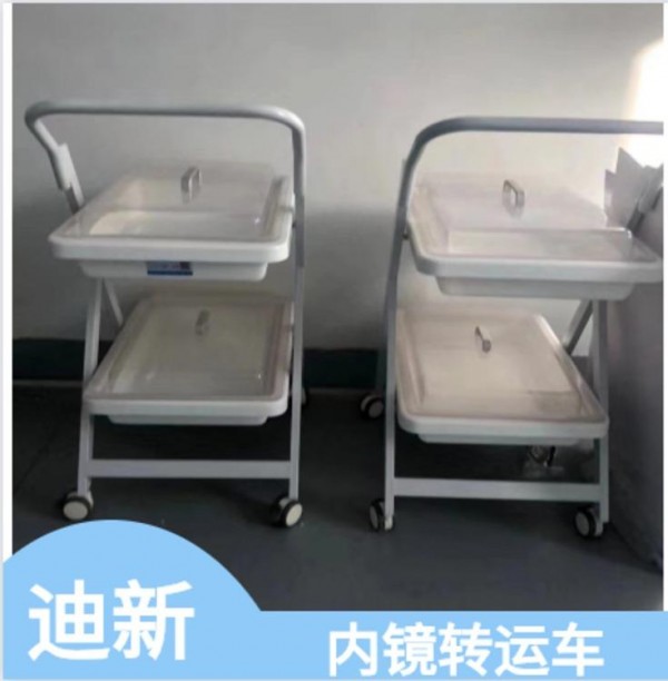 内镜转运车其周转箱材料亦由制造清洗槽台面的高分子复合材料独立开模制成,车体由不锈钢喷塑而成,具有耐腐蚀、不沾水、车行顺畅、取放方便等优点。盆内内镜存放导航隔条使污染部位和非污染部位分离。多层设计使客户在使用过程中可将清洁和污染的内镜分层标明后置放,避免交叉感染等功能