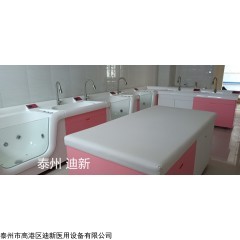 池内为适用婴儿洗澡设计了曲线模形,池上面可套防感染一次性塑料套,池边有防溢水导水沟及下水,有护理操作人员抗疲劳靠手设计,台面后端设有温控操作系统,池边设有洗澡用品放置专用区。