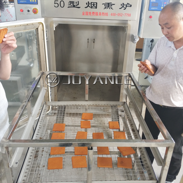 用商用100型豆干烟熏炉,四川熏豆腐干炉子加工豆干不用跟传统的加工方法一样进行翻面,用烟熏木屑进行熏烤,在炉内进行高温循环,让豆干的六个面上色都很均匀,用设备比传统的方法省烟熏材料,烟熏炉的发烟箱装置放少量木屑,可以快速熏制完成,烟熏炉比传统的加工方法更佳省人工,同时节省了工作效率,更增强了产品的口感。