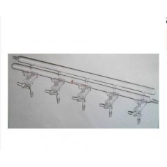 空心节门塞双排管真空气体分配器 该型号双排管真空分配器为带球腔的三通空心玻璃节门,在节门的后部有一个中空的球形玻璃腔,当真空抽气时,球腔内会产生负压,从而使节门塞吸到节门肚上,以提高密封性,节门塞内为平行的双排导气孔,当节门旋转180度时可切换通气或真空,主管上为三个10mm(外径)通气小咀分别为前右,后左