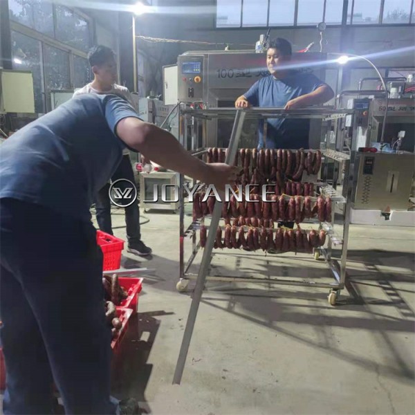 红肠有很多种,有秋林里道斯、商委、哈尔滨、哈肉联等种类,红肠一般就是把肉绞好加入调料味,然后用烟熏炉进行烘干,第一次就行表皮烘干起具有哈红肠特色的核桃纹,在进行蒸煮,把红肠蒸熟,在进行第二次烘干,把红肠蒸煮的水分给烘干,最后一步进行烟熏上色,美味可口的红肠就做好了。环保型香肠红肠烟熏设备,商用红肠熏