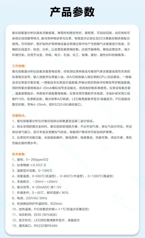 HT-200Y型氧化锆分析仪,是我公司最早开发的智能型氧含量分析仪,具有灵敏度高、再现性和稳定性好、量程宽、可自动切换、响应快和可连续在线测量等特点, 能与各种电动单元仪表,常规显示记录仪及DCS集散控制系统配合使用。可对锅炉、窑炉加热炉等燃烧设备在燃烧过程中所产生的烟气含氧量进行快速、正确的在线显示、检测、分析,以实现低氧燃烧控制,达到节能降耗,降低运营成本,减少环境污染。可广泛应用于冶金、热电、