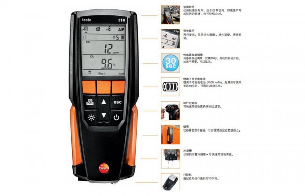 testo 310烟气分析仪测量是烟气分析的核心,可直接测量CO和O2浓度,以及环境和烟气温度。