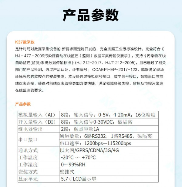 K37型数据采集器:环境监测数据采集系统,对厂矿、企业等单位产生的污水排放、废气排放、环保设施的运行等进行实时监控,从而为环保监测管理部门对这些排放点进行集中管理提供了有效的手段。环境监测信息中心与污染源监测点通过网络进行数据通信,有多种网络可以选择,如无线GPRS/CDMA通信方式,具有实时性强、无须布线、通信费用低廉、网络覆盖面广等优点。如有条件的地方,也可采用ADSL拨号上网的方式,具有速度快、费用低、通信稳定可靠等优点。而如果污染源所属单位已有宽带,并可以提供节点给数采仪使用,则可以直接加以使用,这样也就不会因此产生通信费用。