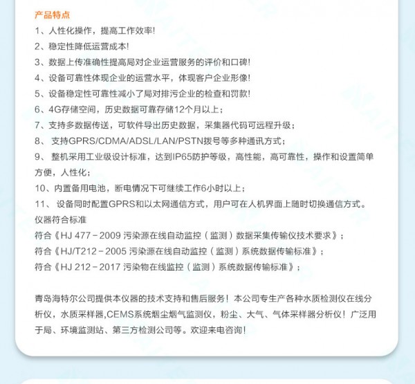 公司拥有技术过硬的研发团队,专业化服务营销团队,专业的工程施工团队,专业的研发团队,优质的产品生产基地,占地面积8000平方米,为客户提供一站式服务。近年来,针对国家新的环保法逐步出台,排污标准的逐步提高,公司不断加大科技创新力度,通过引进吸收国内外技术,研制开发,运用了多项具有高端水平的环保技术。如在线水质检测仪,验室水质检测仪,便携式水质检测仪,烟尘烟气检测仪,烟尘烟气采样器等一大批优质的环保设备系统。我们以“品质至上、诚信为本、创新制胜”为经营宗旨,坚持稳健发展及全国行销策略,为客户提供各式优良产品和全方位的服务。海特尔环保与环保企业共同成长,为发展环保事业共同努力。