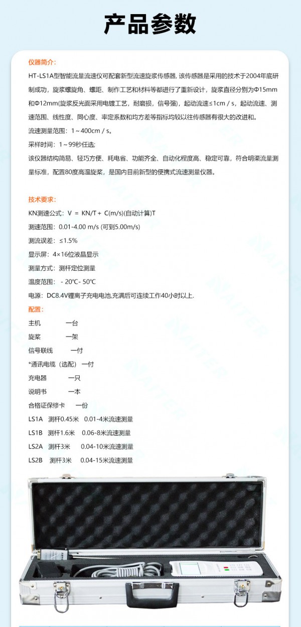 HT-LS1A型便携式流速流量仪(简称便携式流速仪)是专门为水文站、厂矿、监测站、农田排灌、水文地质调查等部门在野外进行明渠流速流量测量而研制的。