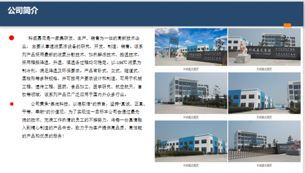 科威嘉尼公司是一家集研发、生产、销售为一体的技术企业,主要从事液氮速冻设备的研究、开发、制造、销售。该系列产品采用加热技术、控温技术和液氮分散技术,使程控升温、恒温、降温各过程均匀稳定。以-196℃液氮为制冷剂,满足降温及环保要求。产品有箱式、柜式、隧道式等多种规格,并可按用户要求设计和制造,可用于机械工程、遗传工程、医药、食品加工、医学研究、植物保存、航空航天、畜牧等领域。