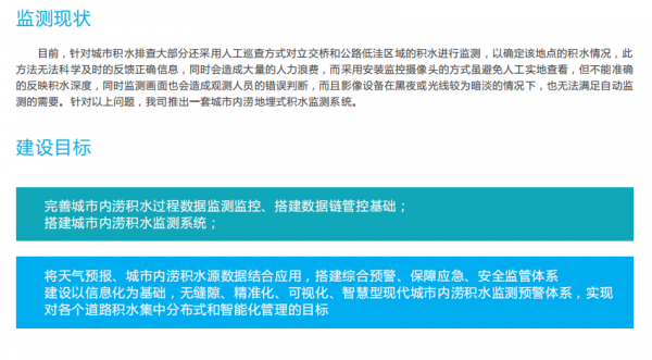 尤其是下穿隧道和下沉式道路,当路过的车辆对该路段积水情况不了解,很容易被突发的积水淹没并困在水中,同时该路段积水难以快速排出车内人员来不及逃生的话,容易造成人员伤亡,此类事件在北京、广州、深川等人口密集的城市已经发生了多起。所以对下穿隧道、下沉式道路内涝进行监测按警问题成了城巿积水问题里面的严重、迫切需要解决的问题。大程度降低道路积水导致的内涝所造成的损失,一方面我们要完善城市排水基础建设,另一方面为掌握城市内涝状况,实现排水的统筹调度。