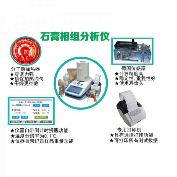 石膏相组成分析仪采用的7寸液晶触摸屏,直接检测出石膏三相结果,无需计算.高清晰液晶屏幕数据查阅一览无余。通过大量对比试验:石膏水分结果与国标GB/T 5484-2000 《石膏化学分析方法》、GB_T36141-2018《建筑石膏相组成分析方法》可达到一致性,极大地提高了检测效率,只需几分钟即可准确测量水分含量%(游离水、附着水、结晶水),同时可检测石膏的三相分析值,并直接计算出石膏的纯度值。产品广泛用于原材料、粉体、颗粒、半成品、成品等材料的附着水及结晶水快速检测,针对非金属矿、建筑石膏、脱硫石膏、磷石膏、天然石膏、工业副产石膏、石膏砂浆、粉煤灰、煤炭、矿粉等样品都能准确的提供水份检测方案。