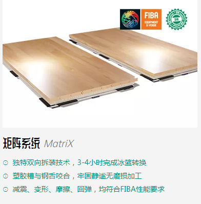 矩阵 MatriX系统是一款先进的拆装式木地板 系统,是国际顶级赛事的选择。2019年 国际篮联世界杯的8块场地均使用的是 QUICKLOCK系统。