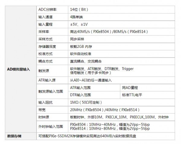 与LabVIEW无缝连接,提供图形化API函数。是一种基于PXIe总线的数字化仪。该板卡提供4路单端模拟量输入,14位ADC采样精度,转换速率高达40MS/s(PXIe8504)/80MS/s(PXIe8514)。