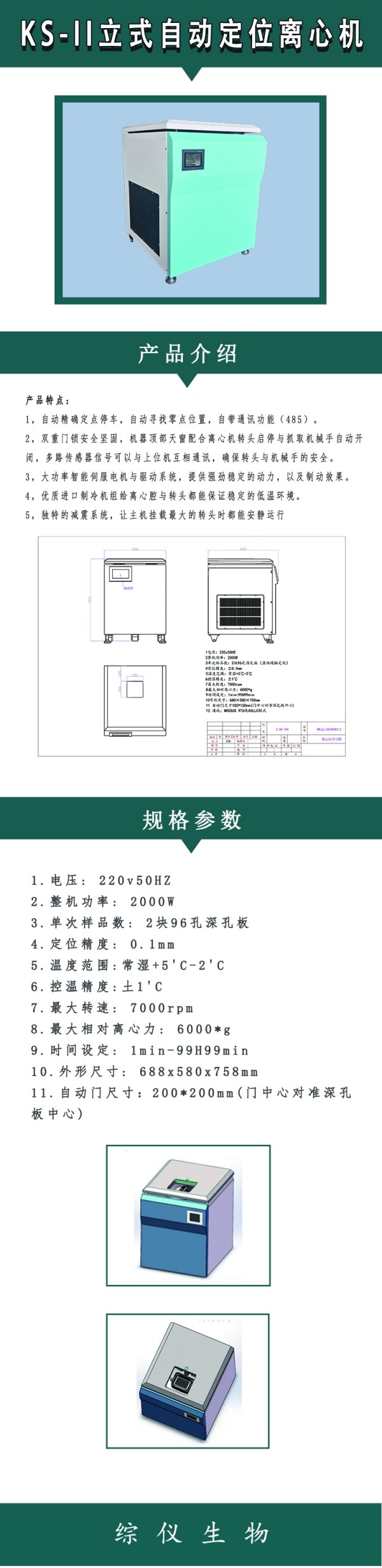 综仪生物KS-II立式自动定位离心机 可定制1,自动精确定点停车,自动寻找零点位置,自带通讯功能(485)。2,双重门锁安全坚固,机器顶部天窗配合离心机转头启停与抓取机械手自动开闭,多路传感器信号可以与上位机互相通讯,确保转头与机械手的安全。