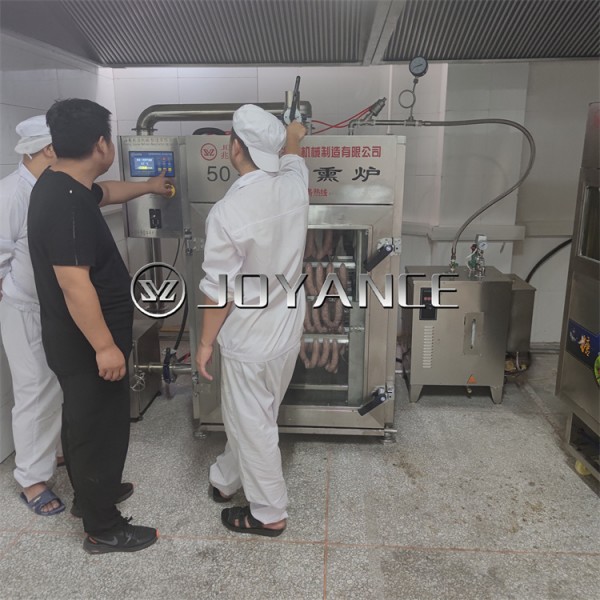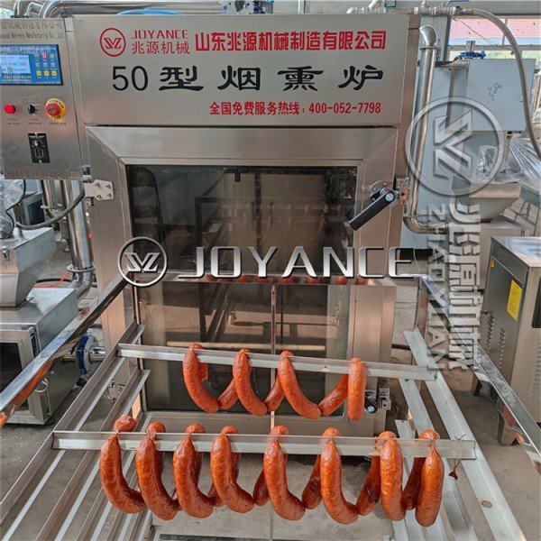 ②100型全自动烟熏炉,红肠腊肠烟熏设备独立设计的投料装置,杜绝烟熏时箱体内部温度骤降的弊端。