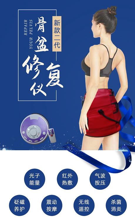 骨盆护理:通过骨盆修复仪中4个气囊,有节奏的加压放送,对骨盆的挤压可改善骨盆宽,盆腔位置的后面感觉温热及震动,同时还可缓解卵巢和痛经等妇科问题及便秘。